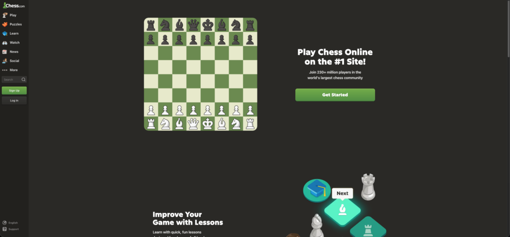 Chess.com offers unlimited online chess against players worldwide or AI opponents at various skill levels. Tutorial lessons teach strategies while puzzle challenges improve pattern recognition.