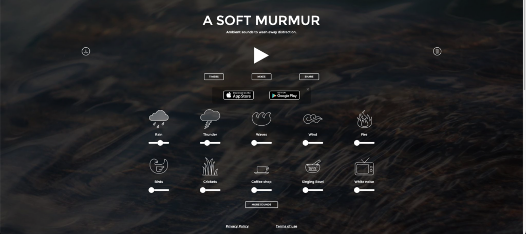 A Soft Murmur combines ambient sounds, rain, thunder, waves, wind, fire, birds, crickets, and white noise into custom soundscapes. Adjust individual volume sliders, creating perfect background audio.