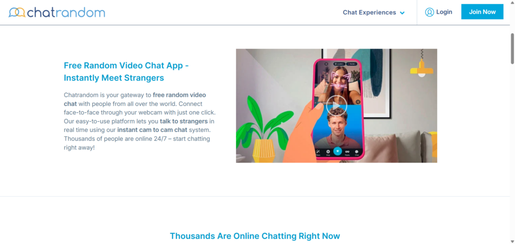 Chatrandom provides random video chat for millions without account requirements or point systems. Multiple chat modes include random matching, gender-specific rooms, and group video options. Country and language filters narrow matches geographically.